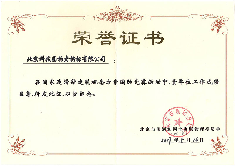 2022年國(guó)家速滑館建筑概念方案國(guó)際競(jìng)賽榮譽(yù)證書