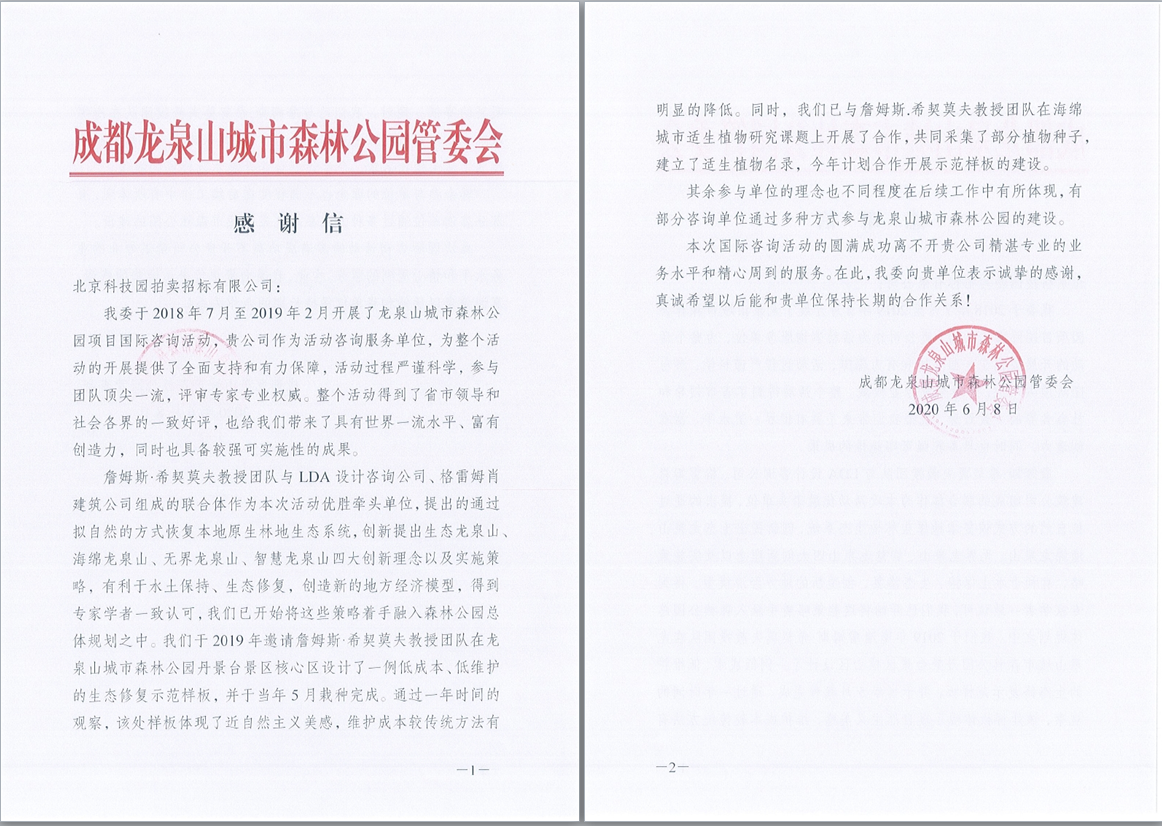 成都龍泉山城市森林公園管委會(huì)感謝信(2020.6)